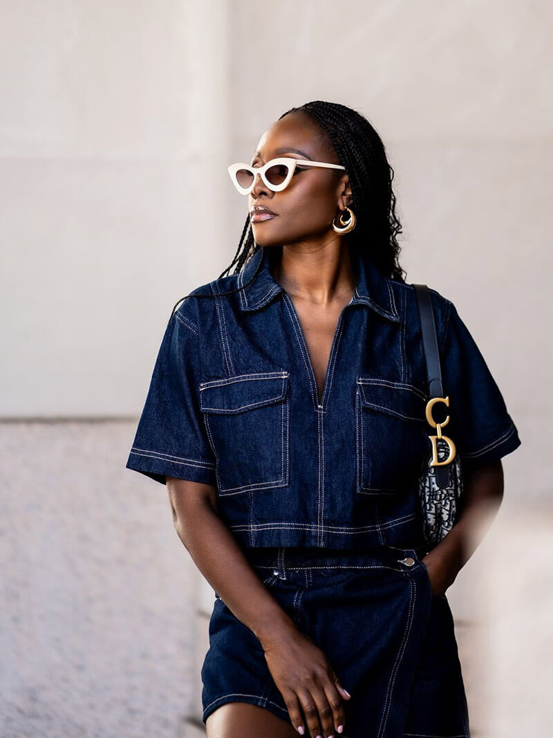 Introducing our Jane Jeans Set, crafted from denim for an effortless blend of style and function. This cropped top with mini skirt shorts features a shirt with a turn-down collar, V-neckline, short sleeves, and patch flap pockets at the front. The short culottes come with a high waistband and front pockets, making it perfect for everyday autumn wear. With an autumn, everyday, classic, cool aesthetic, it seamlessly complements your look, whether you're strolling through the city or enjoying a casual day out. Elevate your collection with this essential piece.
