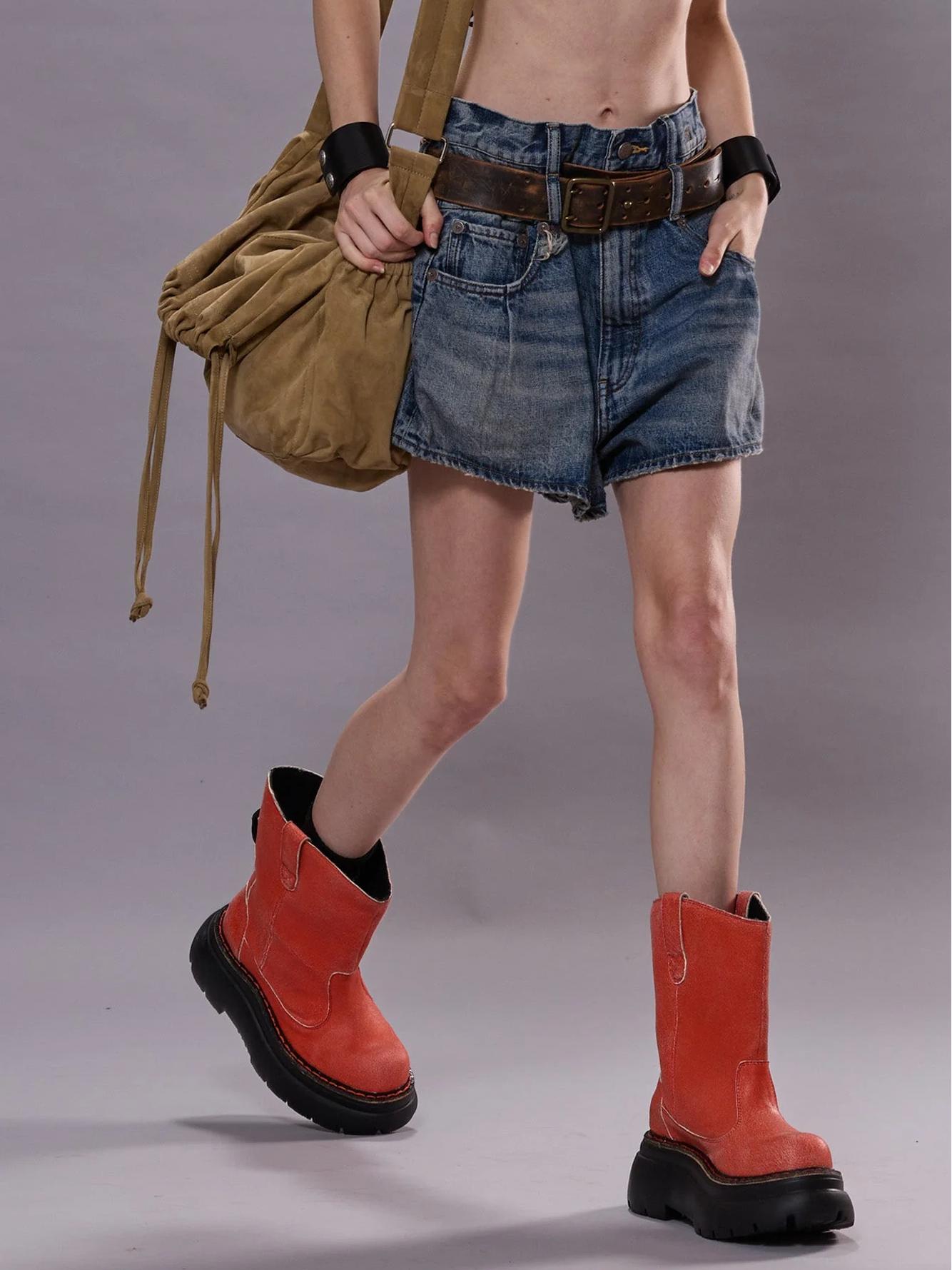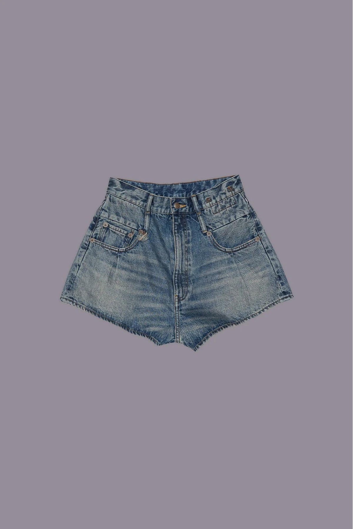 Relaxed baggy shorts with a low drop crotch and dual belt loops for flexible styling and pleats below the pockets for fullness. Built with mid-weight Japanese rigid indigo denim and treated with a medium indigo wash and mild wear pattern.
